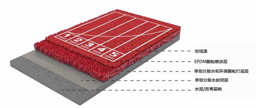 06.跑道画线层:跑道画线漆为本公司专用油性划线漆,甲乙组1:1搅拌均匀后,用跑道划线机或空压机喷涂即可。